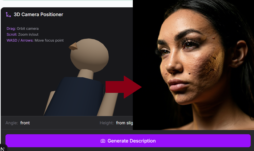 Non conosci il nome di un'inquadratura? Posiziona come preferisci la camera in uno spazio 3D interattivo. Orbita attorno al soggetto con il mouse, zoom con scroll, sposta il focus con WASD. L’output viene scritto in linguaggio naturale, pronto per il Synthetic Brief.