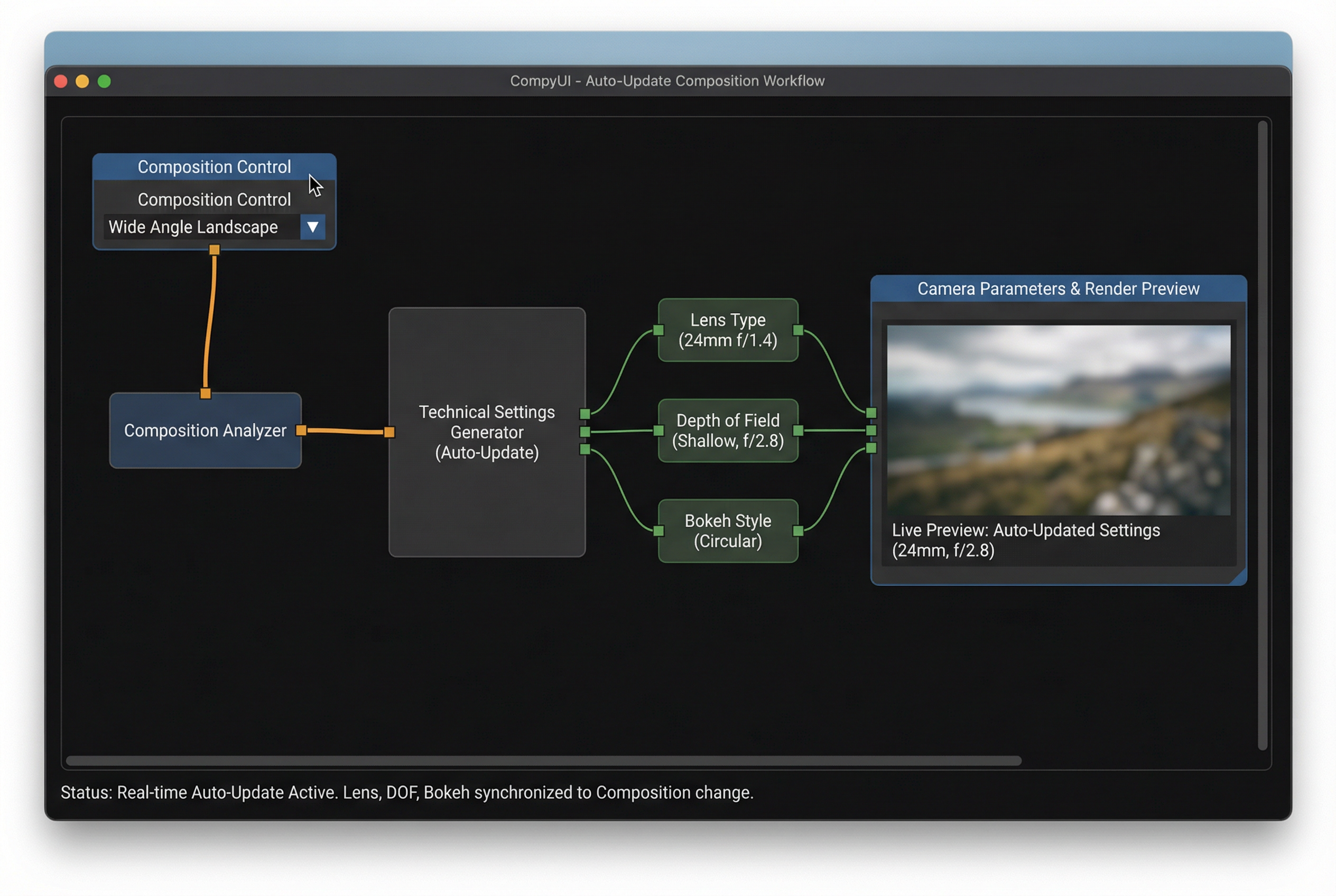 Cambia la composizione, e le impostazioni tecniche si aggiornano automaticamente: lente, profondità di campo e bokeh si adattano in tempo reale senza toccare nulla.
